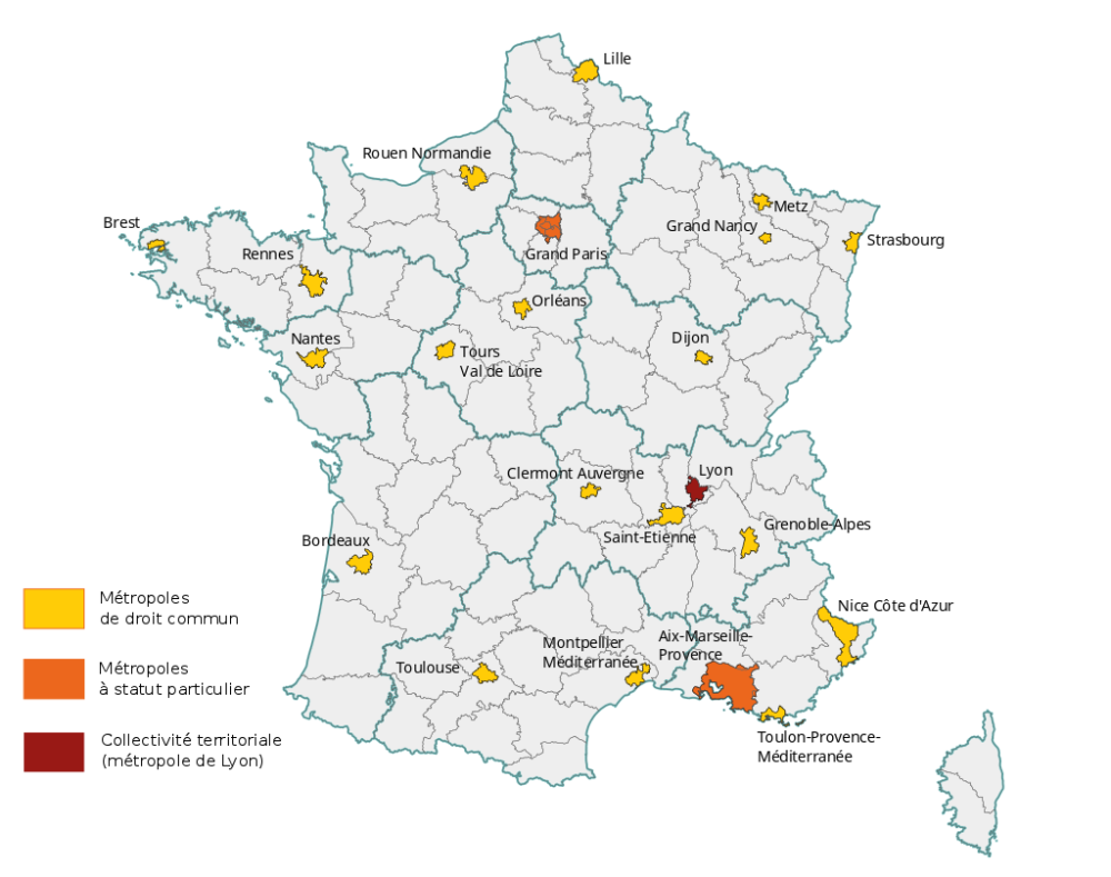 I- DÉFINITION DES MÉTROPOLES ! Au 1er janvier 2019, il existait vingt-et-une métropoles : dix-neuf métropoles de droit commun : Bordeaux, Brest, Clermont-Ferrand, Dijon, Grenoble, Lille, Metz , Montpellier, Nancy, Nantes, Nice, Orléans, Rennes, Rouen, Saint-Étienne, Strasbourg, Toulon, Toulouse et Tours. Et deux métropoles à statut particulier (Aix-Marseille et le Grand Paris). La métropole de Lyon, créée par la loi MAPTAM, est un cas particulier puisqu’il s’agit pas d’une intercommunalité. mais de la fusion d’une interco avec un département, el Rhône. . Une petite moitié des métropoles a moins de 300 000 habitants. La métropole du Grand Lyon a un statut particulier, née en 2015 de la fusion de la Communauté urbaine de Lyon (59 communes) et du Conseil général du Rhône; elle compte 1,402 000 habitants . La métropole de Paris, crée le 1 janvier 2016, regroupe quant à elle 131 communes et compte plus de 7 millions d’habitants.
